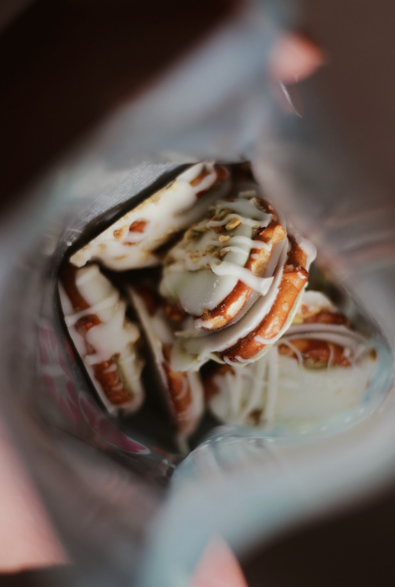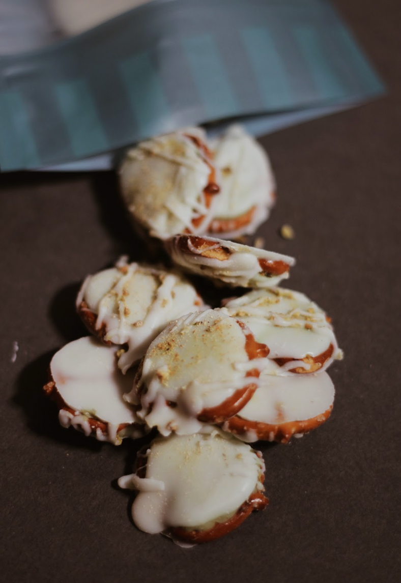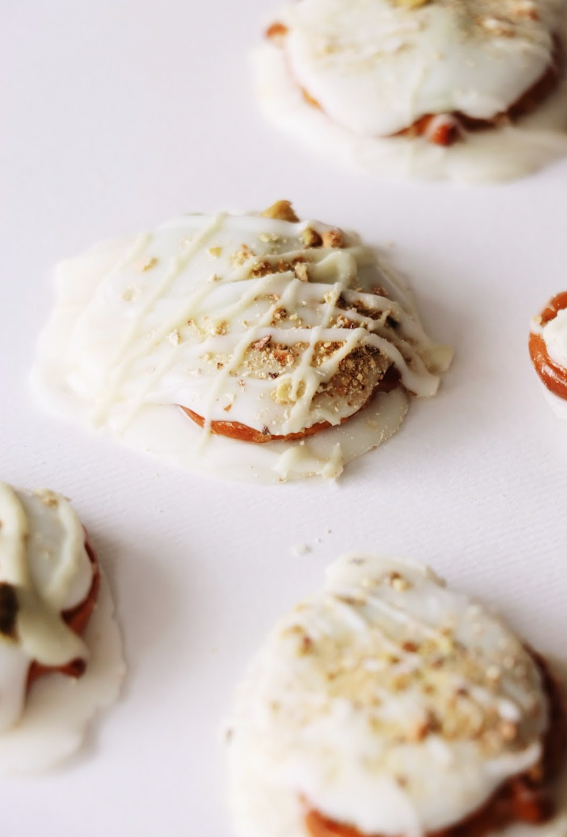 Deliciosos bites de pretzel y relleno de pistache, cubiertos con chocolate blanco.