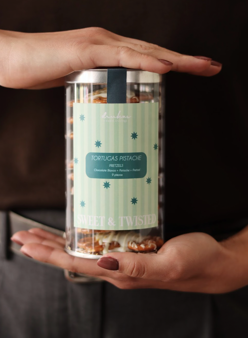 Deliciosa tortuga de pretzel con relleno de pistache y chocolate blanco.